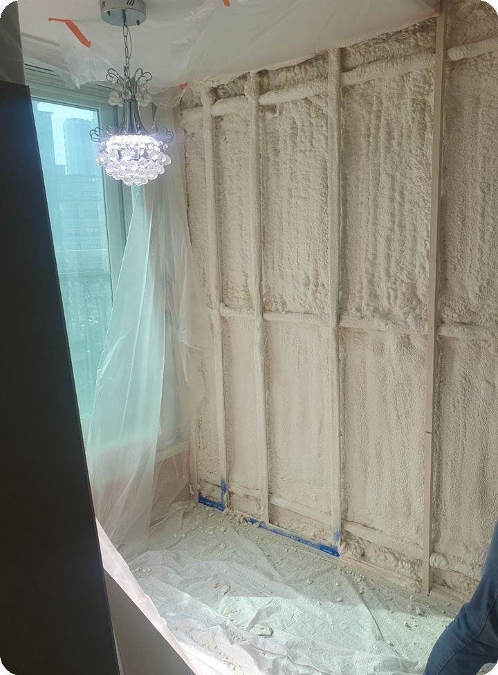 아파트 내벽은 구조체(콘크리트)와 실내 마감층 사이에 불연속 구간 및 미세 공극이 생기기 쉽다. 해당 공극은 외기 영향(냉기·습기)이 침투하는 경로가 되며, 체감 온도 저하 및 결로 리스크를 확대한다. 따라서 본 현장은 단열재를 “부착”하는 방식이 아니라, 공극 자체를 직접 충진하는 우레탄폼단열 방식으로 접근했다.